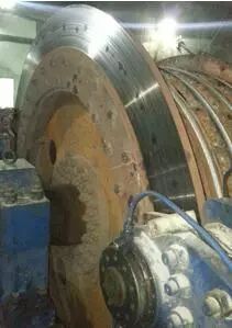 經(jīng)專業(yè)部門到事故現(xiàn)場進(jìn)行檢測,該提升機(jī)配置4 對 TP1-63 制動器頭,輸出正壓力分別為 5、15、15、20 kN;現(xiàn)場檢測制動盤偏擺量達(dá)到 3 mm,大大超出規(guī)程要求的 1 mm;液壓站zui高油壓為 3.3 MPa;全制動時液壓系統(tǒng)殘壓達(dá)到 1 MPa。